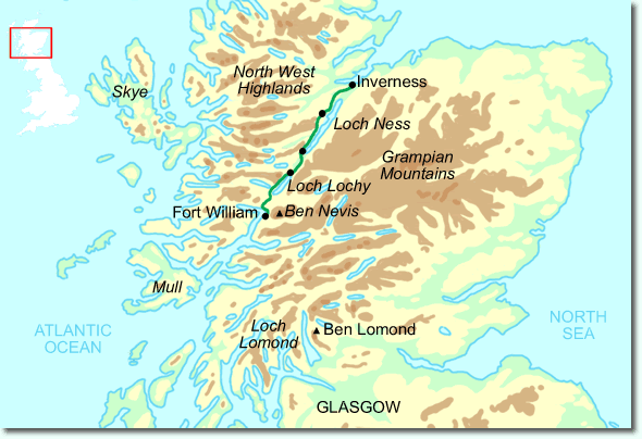 Great Glen Scotland Map. Map of the Great Glen Fault and other late Caledonian strike-slip faults in Scotland and northwestern Ireland. The Great Glen Way Route Map. The route follows the major natural faultline of the Great Glen which divides Scotland from coast to coast. The Great Glen Fault is a strike-slip fault that runs through the Great Glen in Scotland. The first section of the Great Glen Way starts in Fort William and passes through suburbs overshadowed by the great bulk of mighty Ben Nevis. The Great Glen Way travels the length of the Great Glen, beginning in Fort William and ending at Inverness Castle. Follow the salmon upriver to the fjord-like lochs of Lochy and Arkaig. Most of the route keeps to lower levels, following the complete lengths of two lochs and the forests above Loch Ness.