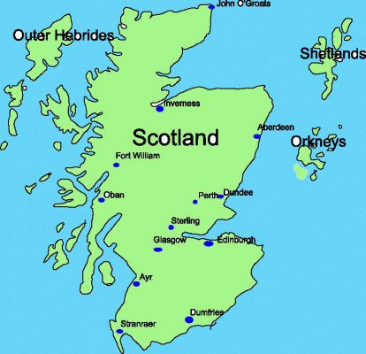 Looking at the map, you can see the regions of the Outer and Inner Hebrides, the Shetland Islands, the Orkney Islands, the Scottish Highlands, the Aberdeen and Grampian mountainous areas, and the Southern uplands region of Scotland.