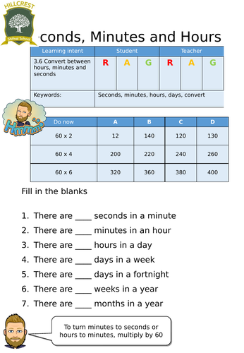 Seconds, Minutes and Hours- Entry Level Worksheet | Teaching Resources
