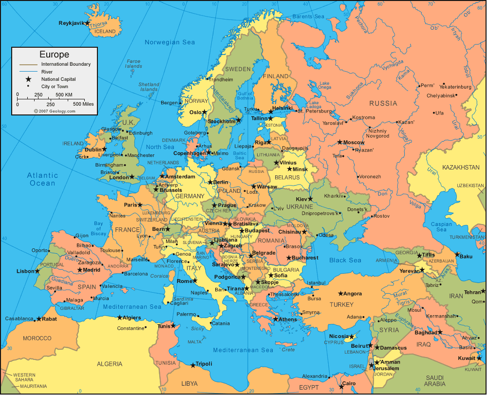 Map Of European Countries 2010. Europe is a continent comprising the westernmost peninsulas of Eurasia, located entirely in the Northern Hemisphere and mostly in the Eastern Hemisphere. The history of Europe is breathtakingly complex. It is bordered by the Arctic Ocean to the north, the Atlantic Ocean to the west, the Mediterranean Sea to the south, and Asia to the east. Today's video comes to us from YouTube channel Cottereau, and it shows the. You can see, download or print this map. Map show: major cities, relief and capitals. As a whole class, review physical and cultural features of Europe from the past several lessons by asking students to come to the front of the room to draw features on the map. Austria's Capital and Major Cities : Description: This map shows governmental boundaries of countries in Europe.